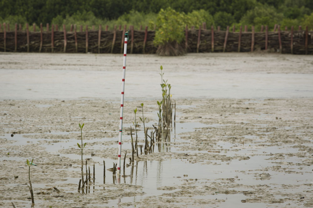 The approach was borrowed from a method already used for centuries to grow land in the muddy Dutch Wadden Sea. In this method, semi-permeable dams are built from wooden poles packed with branches to dampen wave action and allow fine sediment to settle and build up and consolidate behind the dams. Based on the restored sediment dynamics and sediment build-up, mangroves in many cases will recruit and start growing by themselves or can be effectively planted if the right species are placed in the right areas.
