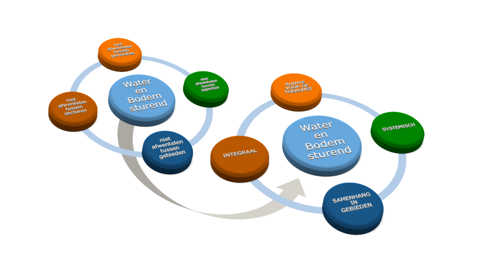 Bij het toepassen van ‘water en bodem sturend’ zijn een aantal noties belangrijk om te benoemen. Het niet-afwentelen principe (links in de figuur) vertaalt zich in positieve zin (rechts in de figuur).