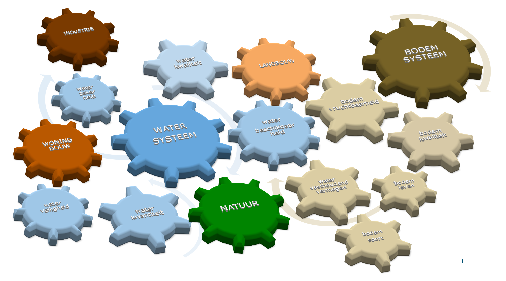 Het bodem-watersysteem bestaat uit veel verschillende onderdelen, die elkaar beïnvloeden. Wil je bijvoorbeeld de waterkwaliteit verbeteren, dan heeft dat gevolgen voor andere onderdelen van het systeem. Andersom is de waterkwaliteit ook te beïnvloeden door aan andere knoppen te draaien, zoals waterafvoer of bodemgebruik.